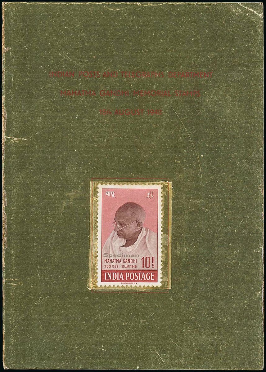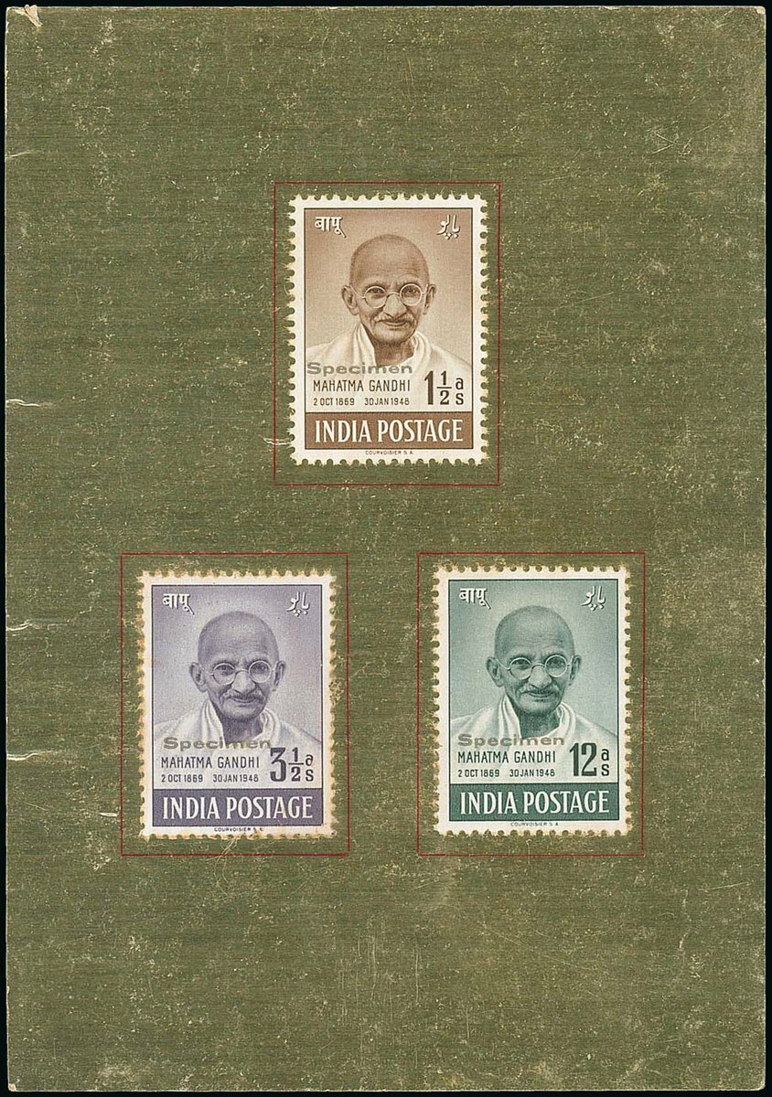 1948 Gandhi ½a. to 10r. overprinted "Specimen", affixed to separated gold leaves removed from the official presentation folder, the 10r. has been removed and replaced in a plastic mount with some minor thin spots; traces of peripheral toning and a few bends and blemishes to the leaves, nevertheless a very rare set presented as such. B.P.A. Certificate (2011). S.G. 305-308s. Photo