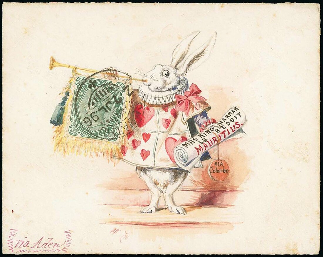 1896 (7 July) hand-painted envelope, "The White Rabbit" from Subathu India to Mrs. King-Harman in Mauritius, via Aden, franked India ½a. incorporated into the design. Charming and rare. Photo