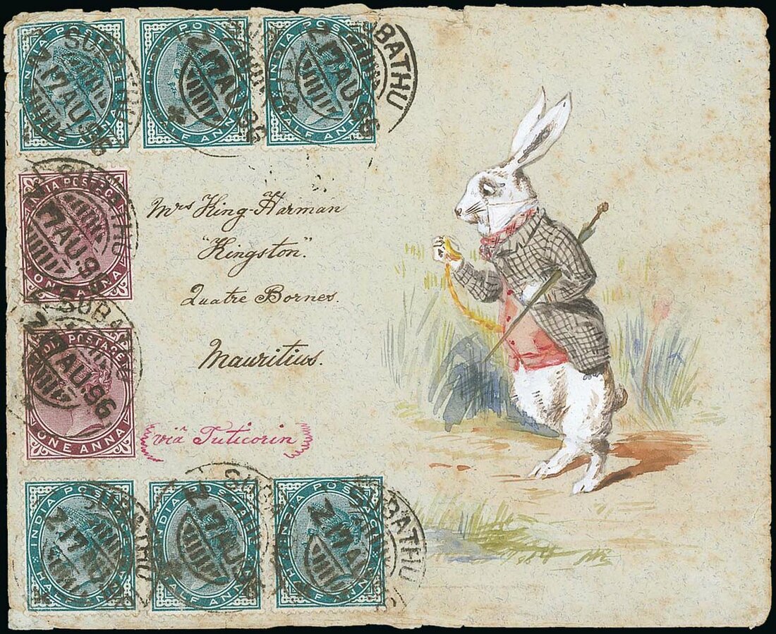 1896 (17 Aug.) hand-painted envelope 'Rabbit telling the time "I'm Late", from Subathu India bearing 1882-90 ½a (6) and 1a. (2) all tied by clear strikes of