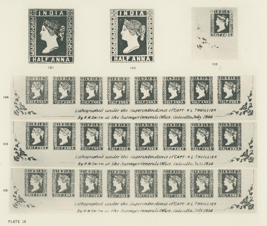 1905 the complete set of twenty three plates from the book "The Postage and Telegraph Stamps of British India" by L.L.R. Hausburg, C. Stewart-Wilson & C.F.S. Crofton, including the famous plates III and IV that were printed directly from the original copper plates; Plate III with ½a. and 1a. printed in black and each in a strip of eight and Plate IV with ½a., 2a. essays (both designs), 4a. and head all printed in black. Minor usual imperfections, a valuable, very difficult set to be found.