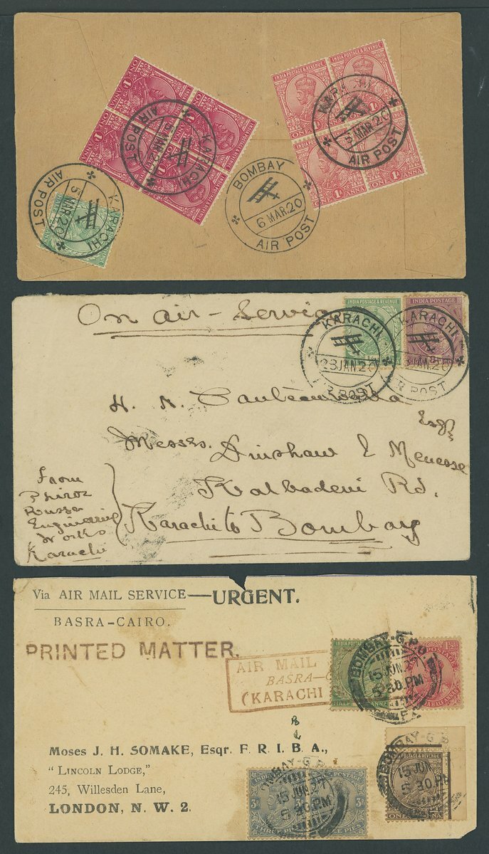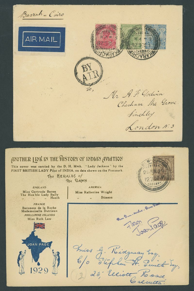 Collection of loose flight covers (60+), various routes, a few signed, noting 1920 Karachi Air Post, 1927 Royal Air Force Display Peshawar, 1927 Basrah-Karachi, 1929 (20 Mar.) uprated 1a. stationary envelope of Gwalior used Calcutta to London, 1929 (4 Apr.) India to Iraq, 1929 (25 June) Dum-Dum Joan Page flight, 1930 Jacobabad to Reti R.A.F. emergency flight, etc., also including 1929 8a. variety missing treetop mint, Mixed condition in places.