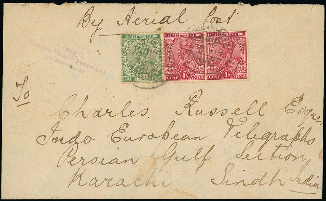 1919 (24 Nov.) Bandar-Abas to Karachi cover, bearing ½a. and 1a. pair, endorsed "By Aerial Post", with violet three-line
