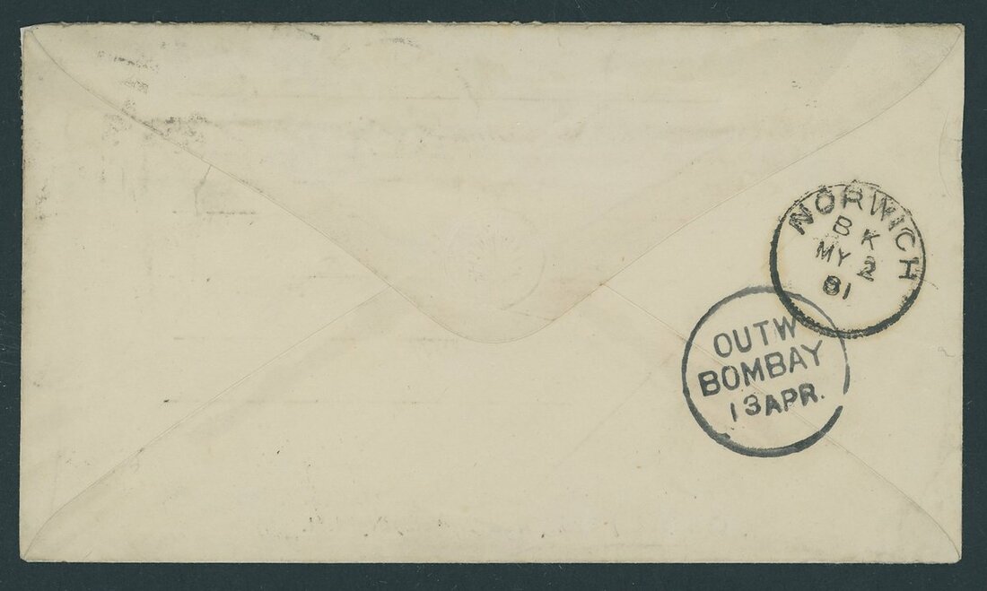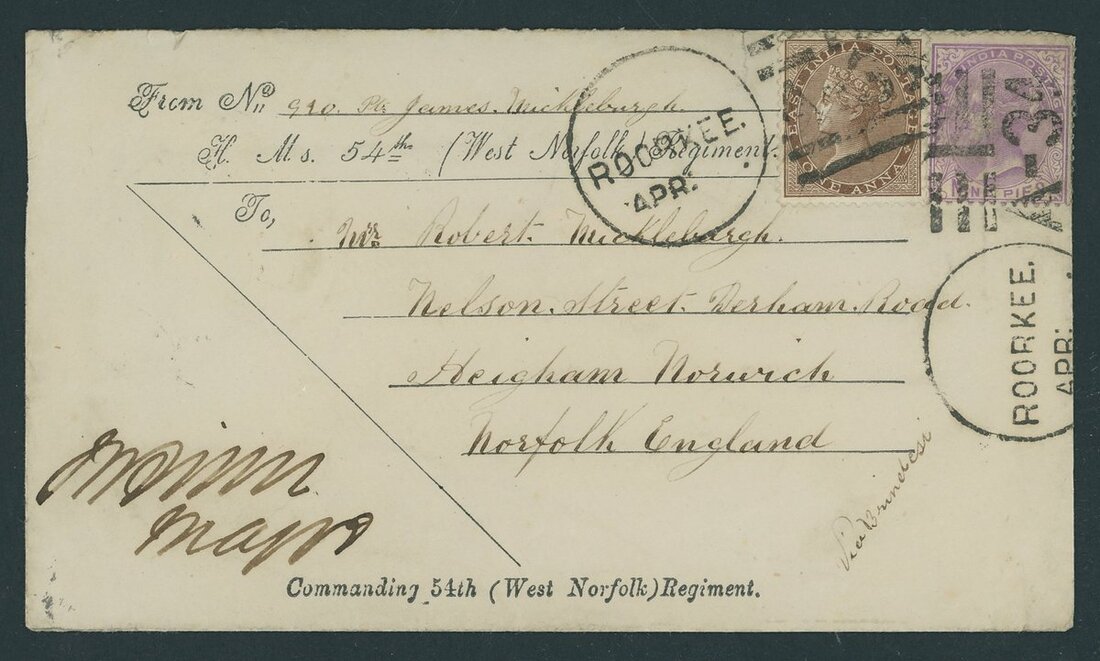 1881 (April) printed "Commanding 54th (West Nortfolk) Regiment." soldier's envelope from Roorkee to Norwich "via Brindisi" bearing 1865 1a. and 184 9p. tied by "