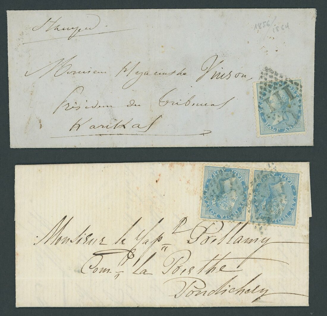 1858 entire to Karikal bearing ½a. blue tied by "C/111" obliterator and showing, on reverse, clear