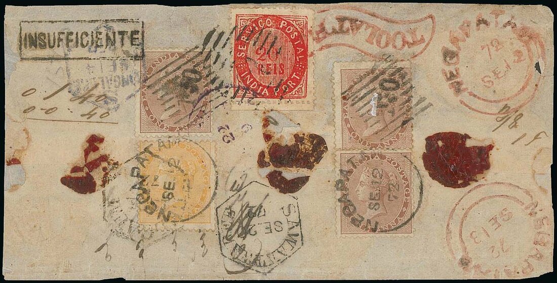 1872 (12 Sept.) native wrapper registered from Negapatam to Goa bearing, on reverse, India 1a. (3) and 2a. and Portuguese India 20r. (Die II) cancelled by