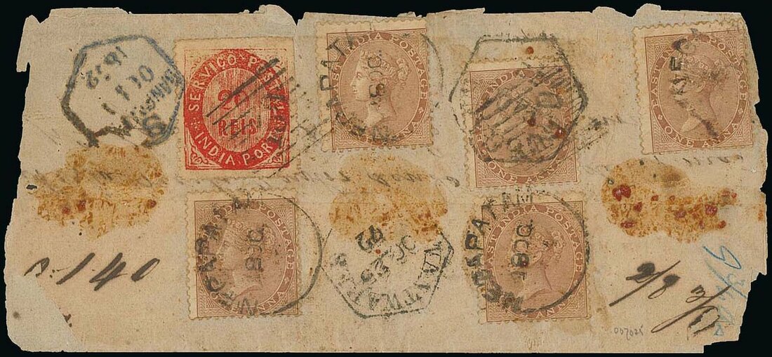 1872 (18 Oct.) native wrapper registered from Negapatam to Goa bearing, on reverse, India 1a. (5) and Portuguese India 20r. (Die II) cancelled by