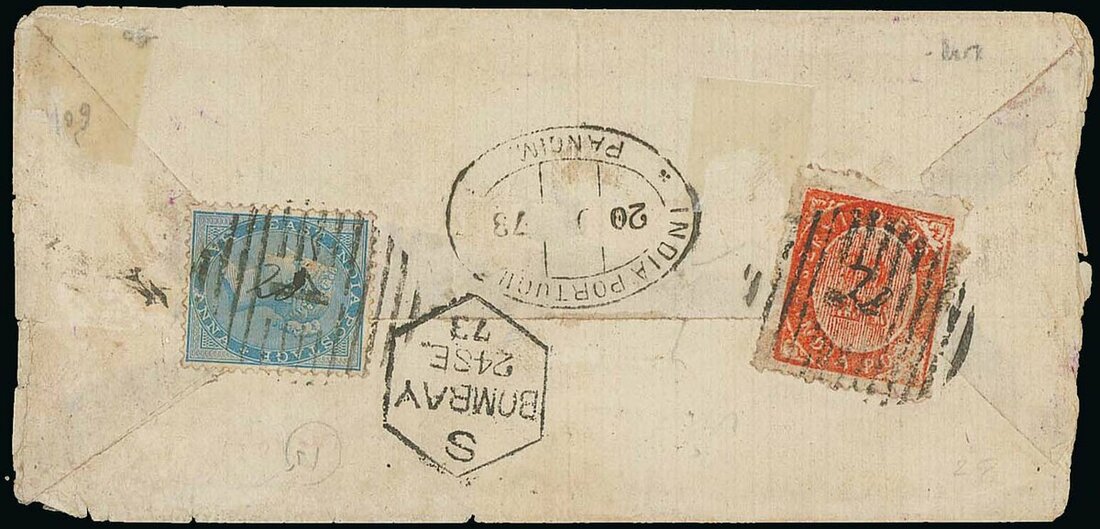 1873 (20 Sep.) envelope to Damaun bearing, on reverse, India ½a. and Portuguese India 20r. (re-issue Die I), tied by barred obliterator and showing