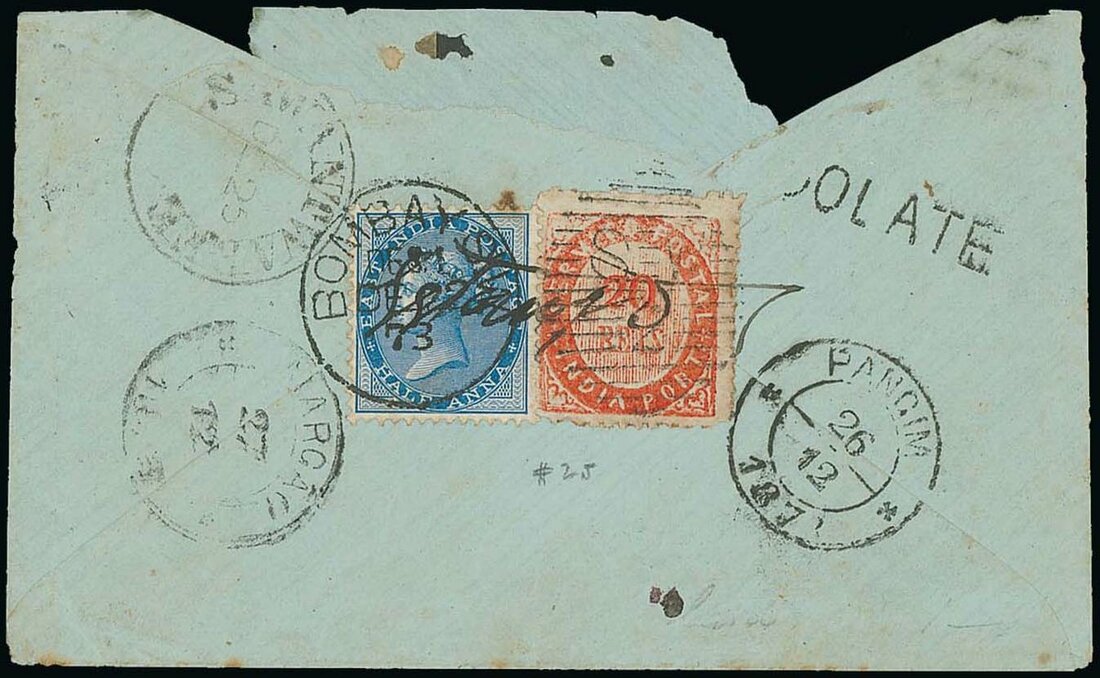 1873 (22 Dec.) envelope from Bombay to Goa bearing, on reverse, India ½a. and Portuguese India 20r. (Die I) cancelled by Bombay duplex and showing