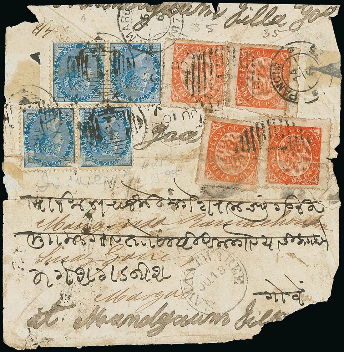 1875 (10 June) envelope from Bombay to Goa bearing, on reverse, India ½a. (4) and Portuguese India 20r. (re-issue Die I) (4), tied Bombay duplex obliterator and showing, Sawantwaree (13.6), Pangim (14.6) and Margao (15.6) d.s. Envelope opened for display, with some usual faults including, envelope roughly opened with small parts missing, creasing and ageing. Nevertheless a spectacular franking. Photo