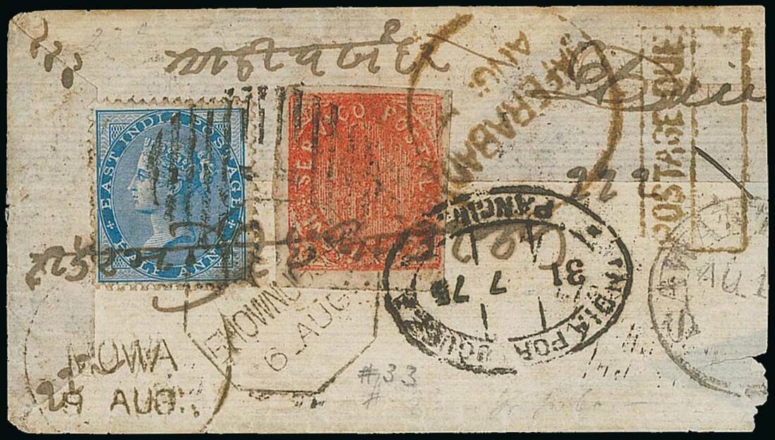 1875 (31 July) native envelope bearing, on reverse, India ½a. and Portuguese India 20r. (re-issue Die II), tied by barred obliterator and showing