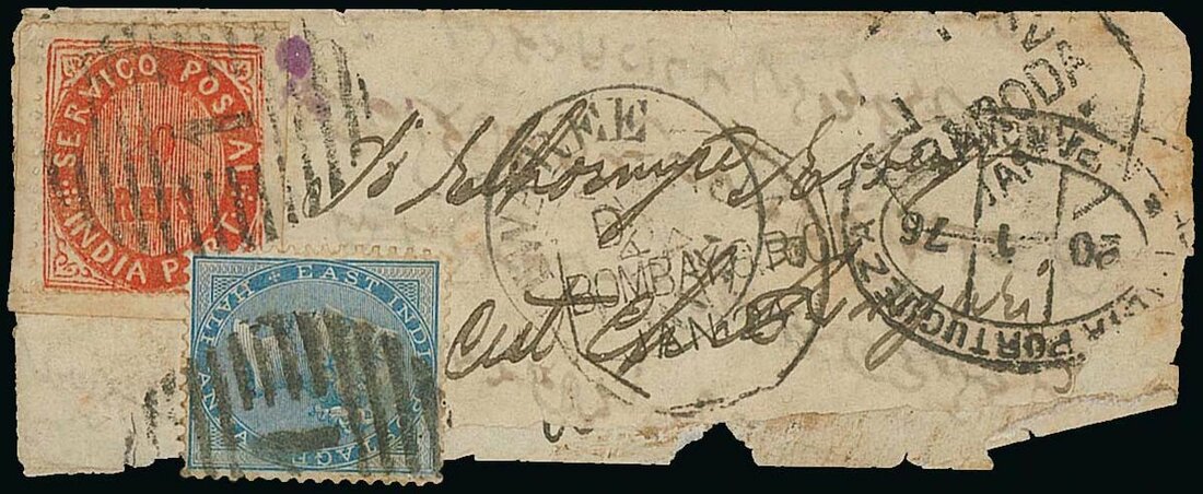 1876 (20 Jan.) small size native wrapper bearing, on reverse, India ½a. and Portuguese India 20r. (re-issue Die II) showing variety inverted