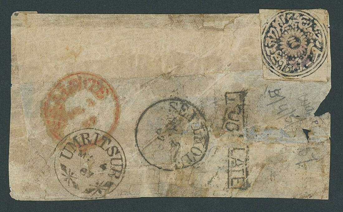 1866 handstamped in watercolours, ½a. black, cut square, touched on three sides, with light purple seal cancellation, on small native cover with Sealkote and Umritsur datestamps and framed Too Late markings. A.P.S. Certificate (1992). S.G. 1a