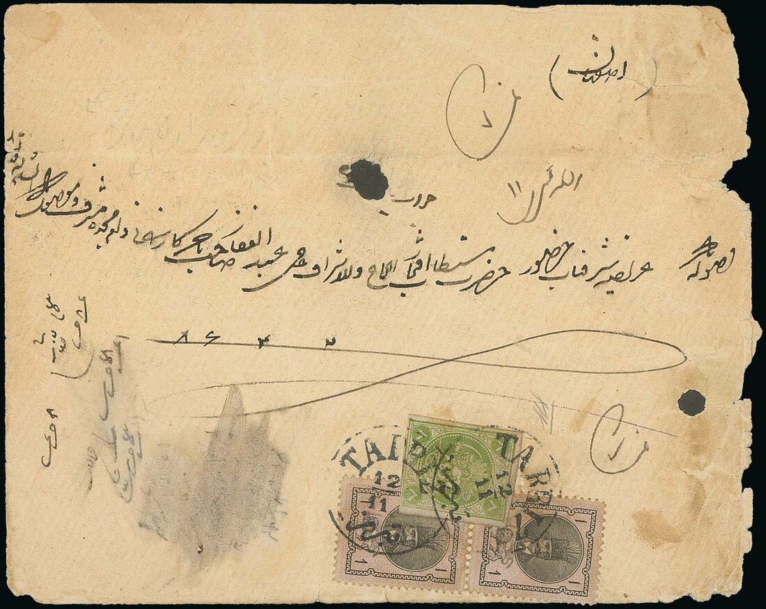 1876 (12 Nov.) envelope from Tabriz to Isfahan franked with an example of the 'Lion' 8sh. green (Type C) and a pair of the 1sh. mauve and black perf. 13 tied by Tabriz (12.11) c.d.s. Envelope with few faults but a very rare combination. Sadri certificate (2025). Photo