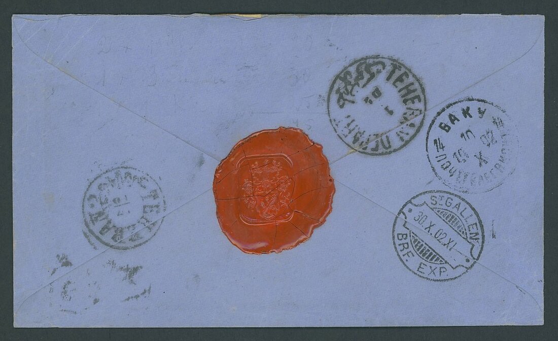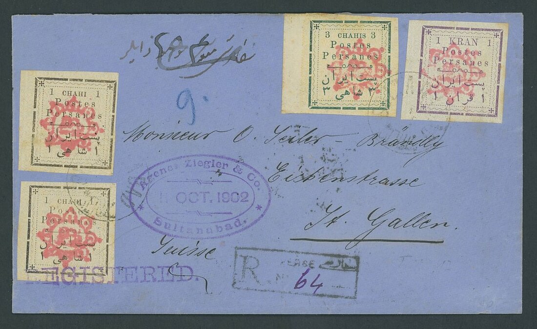1902 (11 Oct.) envelope registered addressed to St. Gallen, Switzerland franked with 1ch. (2) (pos. 5 and pos. 6, second printing) , 3ch. (pos. 5, second printing) and 1kr. (pos. 3), cancelled by Sultanabad despatch c.d.s.; the reverse with Teheran (17.10), Baku (10.10 = Gregorian calendar 23.10) and arrival (30.10). Fine and scarce. I.P.S.C. certificate (2020). Persiphila 248, 250, 254, Scott 247, 249, 253.