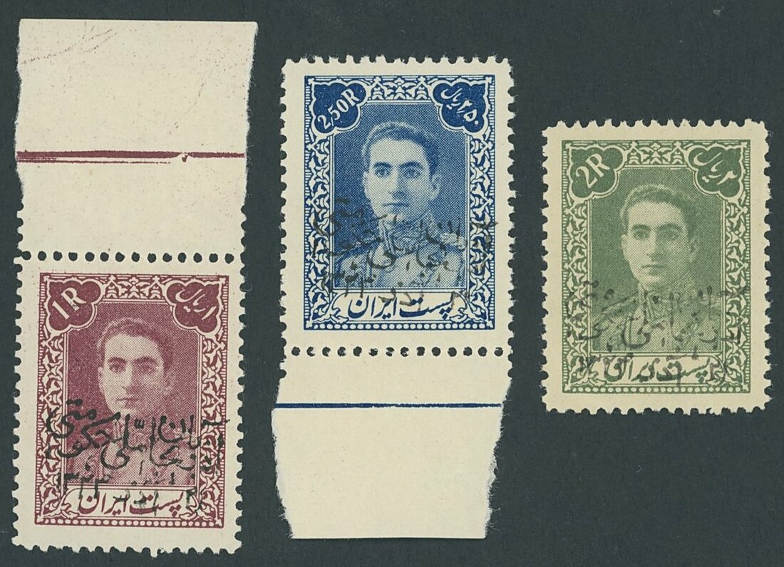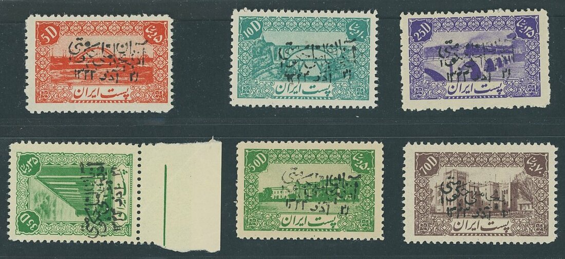 5d. to 10r set of fifteen (missing 3 Rials green), handstamped in Persian characters "Azerbaijan Melli Hokoomati 21 Azar 1324" ("Azerbaijan National Government Dec. 12, 1945"), unmounted mint or traces of hinges (5d., 35d. and 2r.), generally fine and a few values with sheet margin (35d., 1r. maroon, 2.5r., 5r., 10r.). Sadri certificate (2015). A rare set.