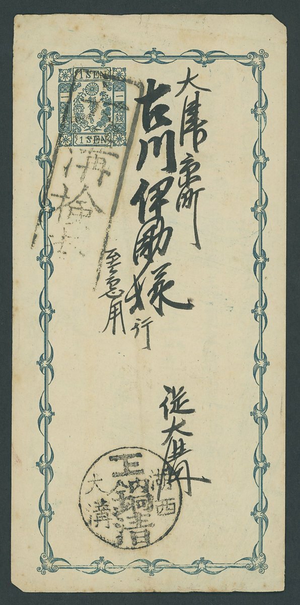 A collection (32) of covers and cards, apparently complete from the 1896 Presentation Album of Japanese stamps "Dai Nippon Teikoku Yubin Kitte Enkakushi"; most (30) have been removed from their original pages, the lot also comprise the cover and title page (without dedication) of the book and few pages of it including the two express labels. In addition two used stationery cards and an unused Gibraltar postal stationery card. Slightly mixed condition as expected, a good lot for the specialist.