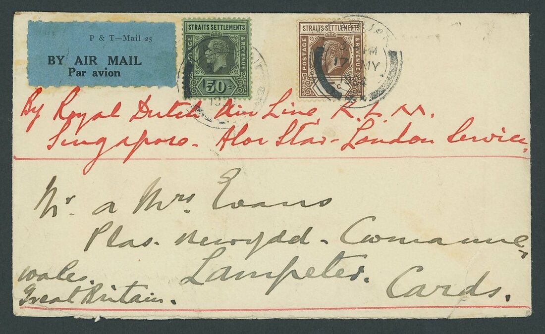 1934 (17 May) envelope to Wales, marked in red ink "By Royal Dutch Air Line K.L.M., Singapore-Alor Star-London Service", bearing Straits Settlements 5c. and 50c. tied by