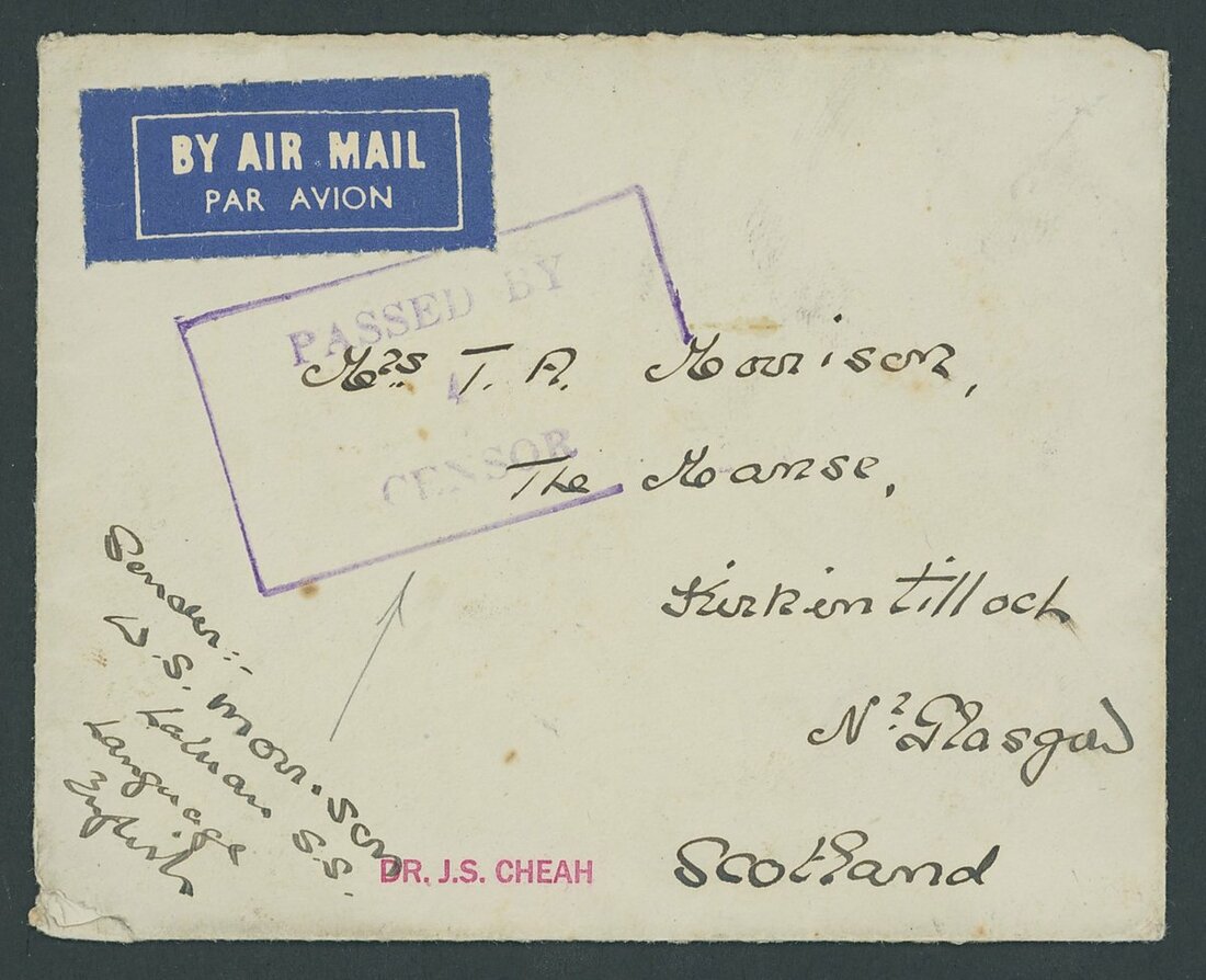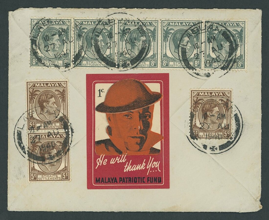 1940 (27 Aug.) envelope to Scotland bearing, on reverse, 1937-41 5c. vertical pair, single and 8c. strip of five, all tied by Labuan Type D11 c.d.s., and Malayan Patriotic Fund 1c. label, the face panel with framed