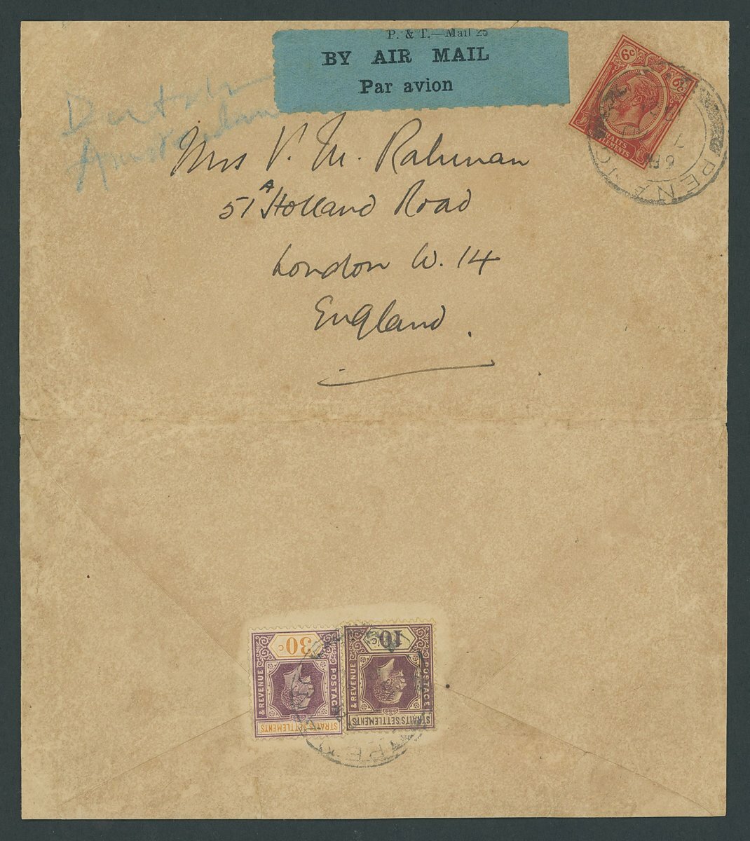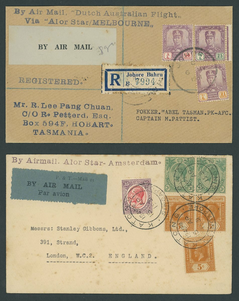 1931 envelopes (5) flown by KLM comprising (15 Apr.) from Katong, Singapore to London, carried on first direct service Alor Star to Amsterdam, franked at 56c.; (6 May) registered from Johore to Tasmania carried on experimental flight from Alor Star and franked at 96c.; (7 Aug.) from Penang to London via Amsterdam and franked at scarce 46c. rate; (1 Oct.) from Kuala Lumpur to Germany via Amsterdam flown at scarce 52c. rate; and (10 Dec.) from Alor Star to England flown at the scarce 56c. rate which was in operation for only one month