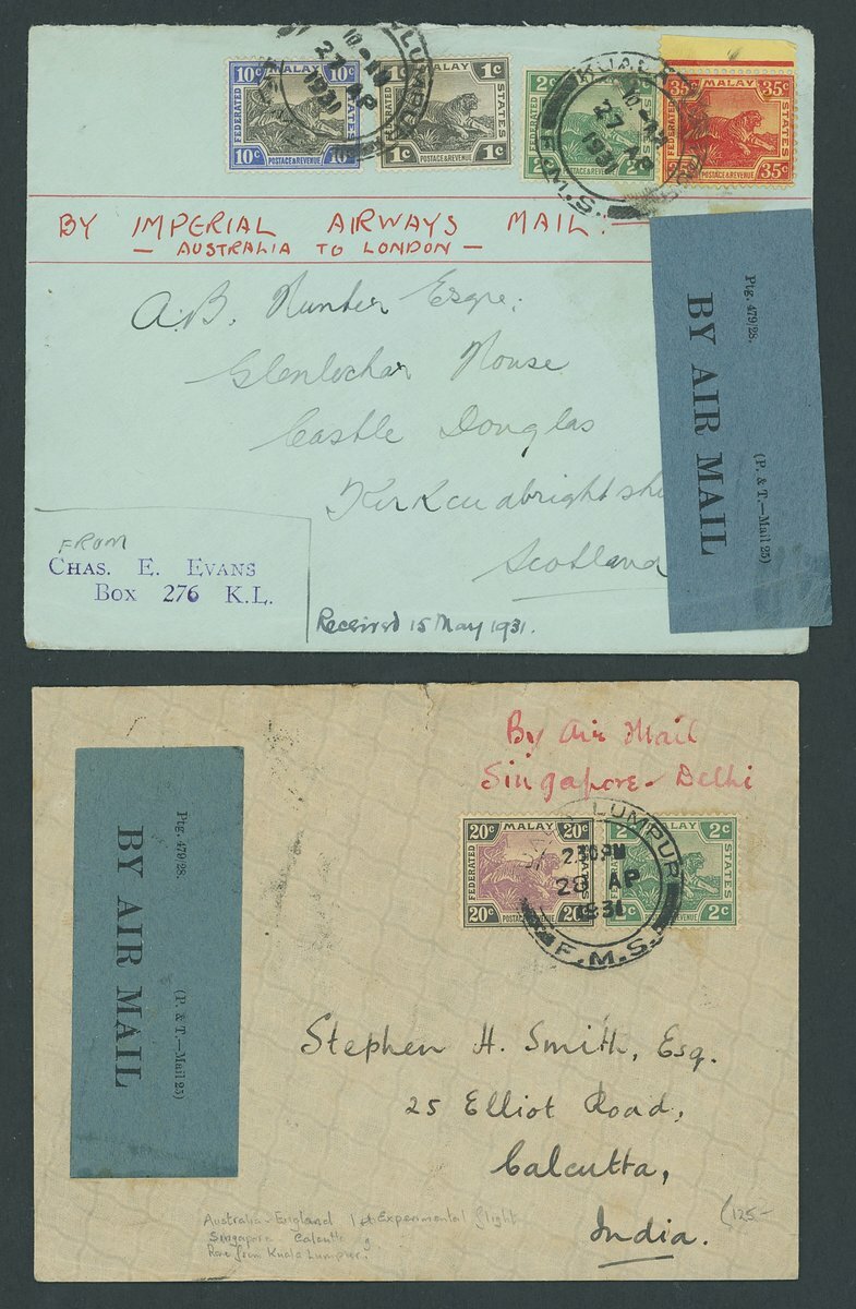 1931 (Apr.) envelopes (2) flown by Imperial Airways from Kuala Lumpur and carried on Australia to London flight, franked at 22c. and 48c. (FMS stamps), both with