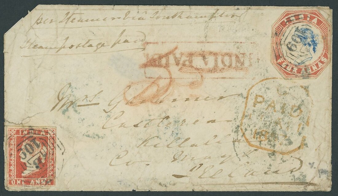 1856 (Dec.) envelope from Malacca to Ireland, marked "per Steamer via Southampton", bearing 1a. Die I and cut to shape 3rd. printing (Head Die III, Frame Die I) 4a. blue and red clearly cancelled "B/109" and showing framed