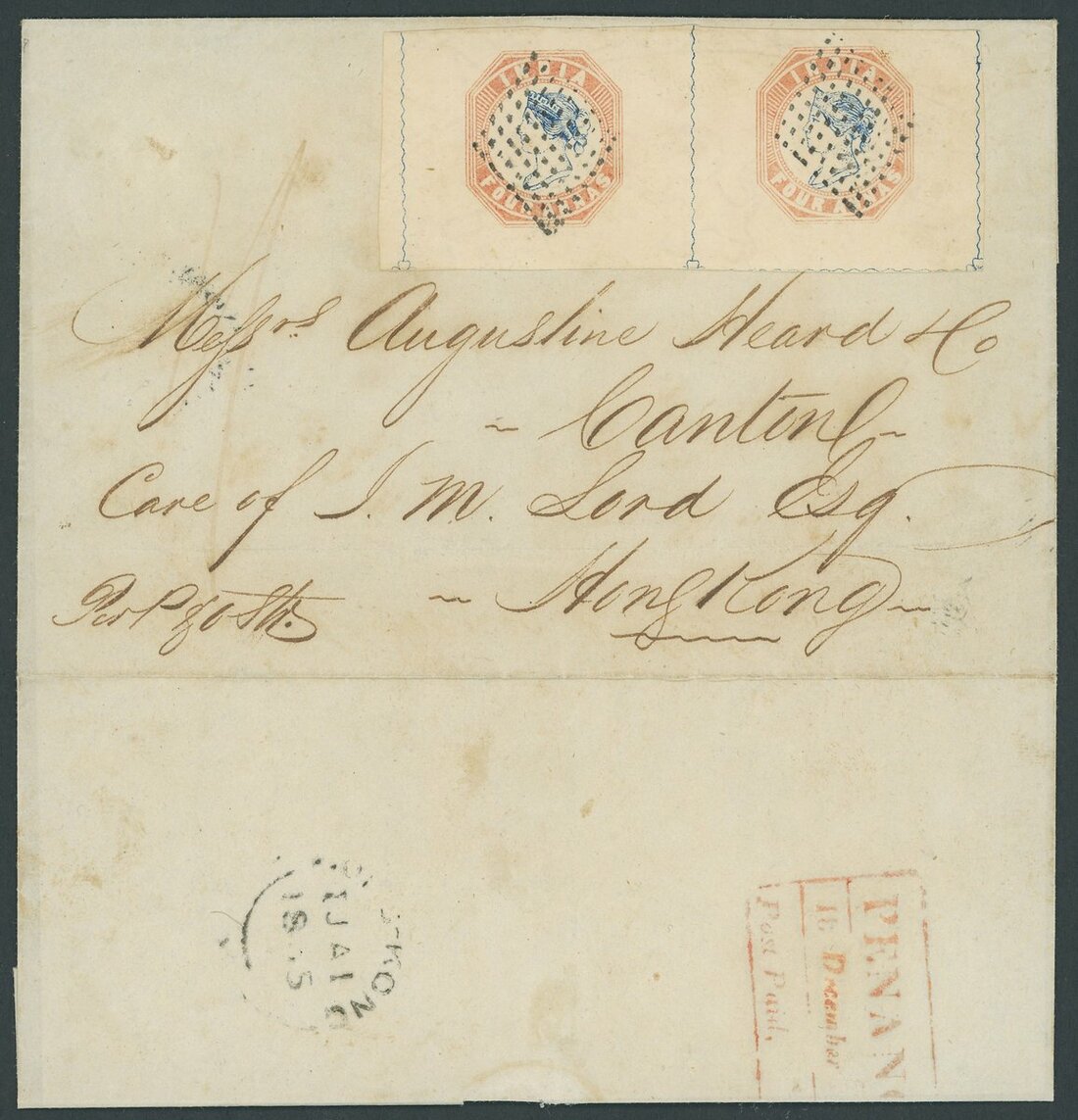 1854 (19 Dec.) entire ex the Heard correspondence to Canton via forwarding agent, S.M. Lord, in Hong Kong, bearing a magnificent 1st printing 4a. blue and pale red pair [2-3] with part rosettes at foot and wavy lines or part thereof on three sides, [2] showing retouched chignon and the whole head of [3] extensively retouched, both cancelled by diamond of dots (10x9), rated "1/-" and showing, on reverse across join, framed