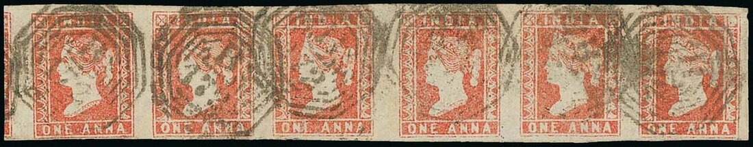 1a. red Die I strip of six [26-31] with watermark inverted, large to clear margins showing portion of adjoining stamp at left, each cancelled "B/172". A fine and desirable multiple. S.G. Z61, £2,250+. Photo