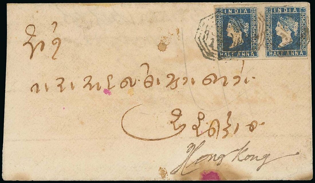 Undateable envelope from Singapore to Hong Kong, bearing ½a. blue Die I horizontal pair (just into at lower left) clearly tied by "B/172", showing manuscript "4" with very light arrival datestamp on reverse. Association of Singapore Philatelists Certificate (2013). Photo
