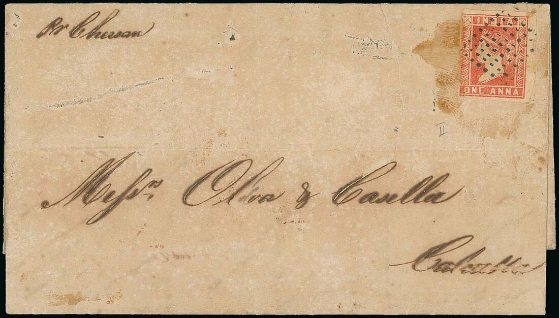 1855 (2 June) entire letter from Singapore to Calcutta, marked "Pr Chusan", bearing 1a. dull red Die II (just into at lower left) cancelled by diamond of dots and showing, on reverse, framed