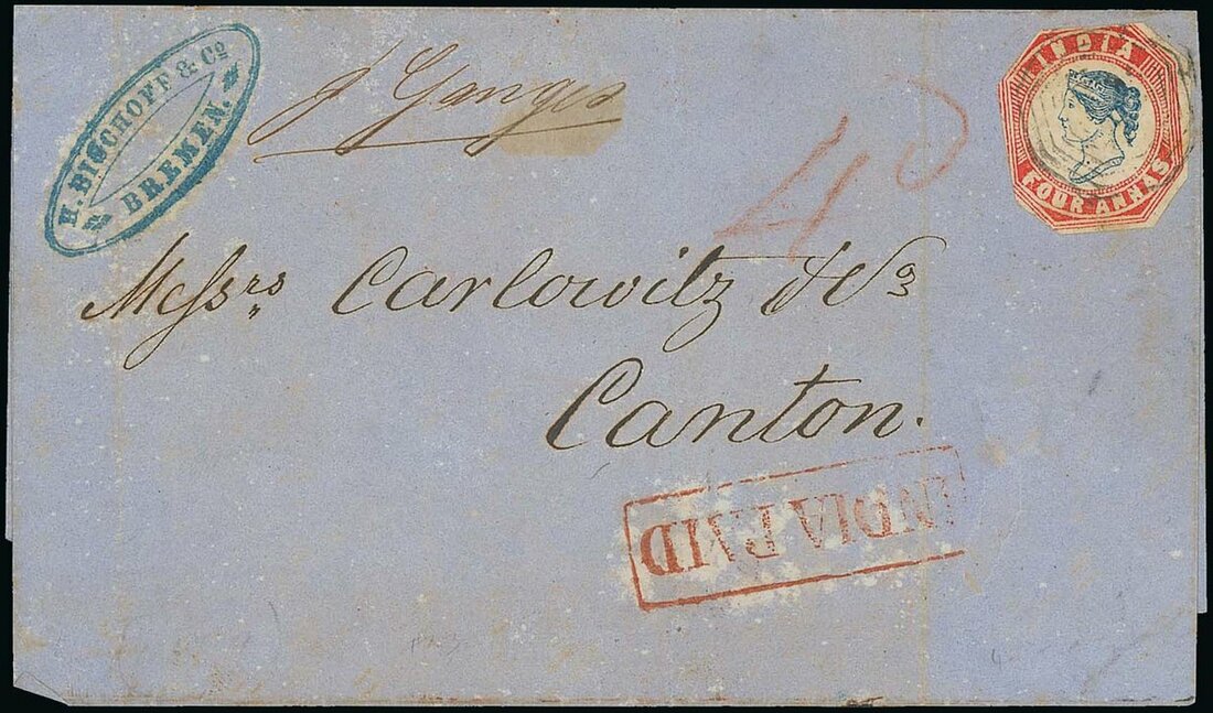 1856 (27 June) entire from Bremen (Bischoff & Co, Bremen cachet at upper left) to Canton, marked "p Ganges", bearing 4a. red and blue 3rd. Printing cut to shape, cancelled by light "B/172", showing red crayon "4d", framed