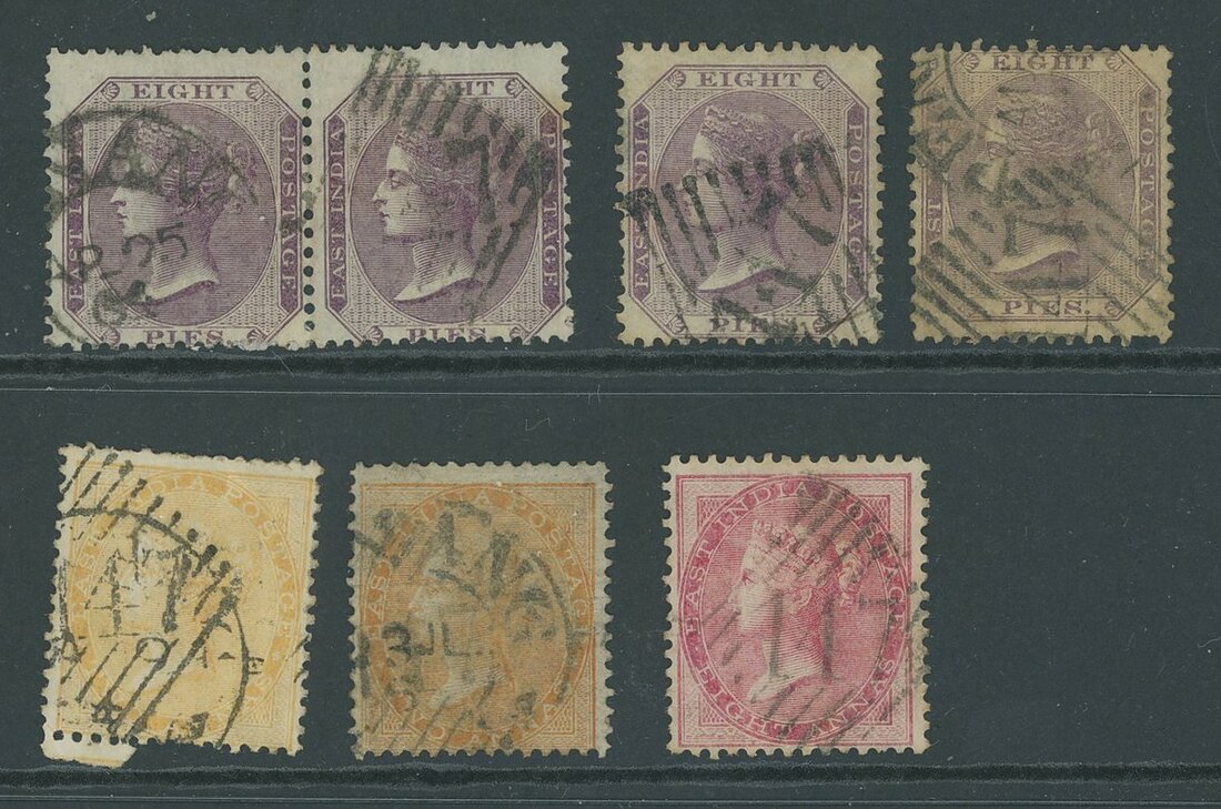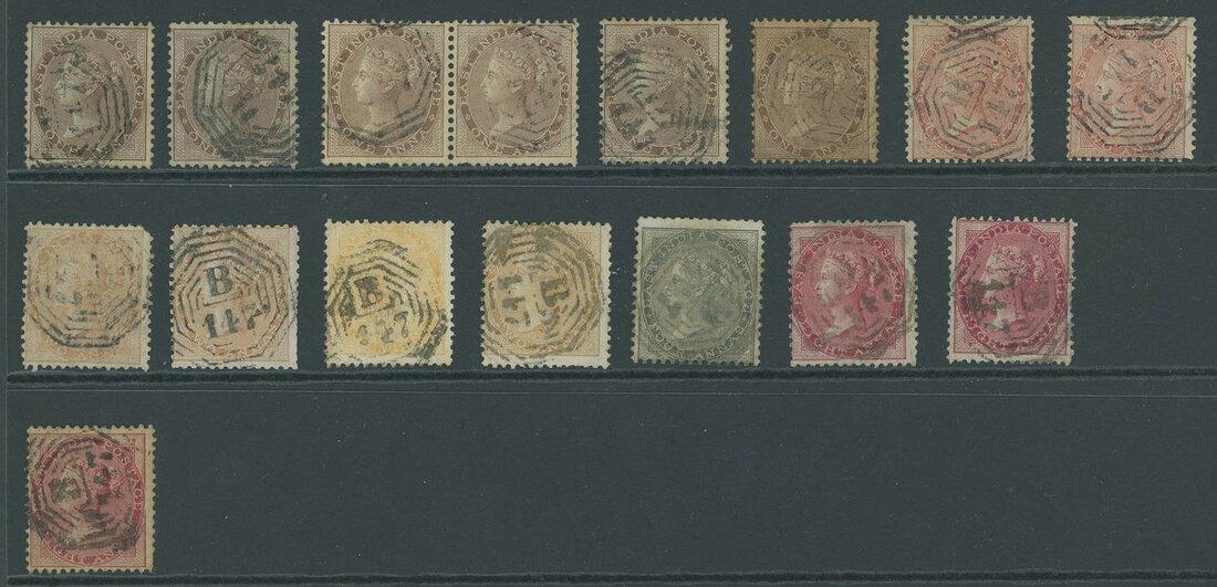 1856-64 1a. (6 including a pair), 2a. dull pink (2), 2a. yellow-buff (2), 2a. yellow (2), 4a. and 8a. (3), each cancelled "B/147"; 1a strip of four on piece, 4a., (8a. (2) and 1860 8p. (2) on piece, plus 2a. yellow, 2a. orange, 8a. and 1860 8p. (4 including a pair), all cancelled by part strikes of "147" duplex. Fair to fine strikes. Cat. £4,625