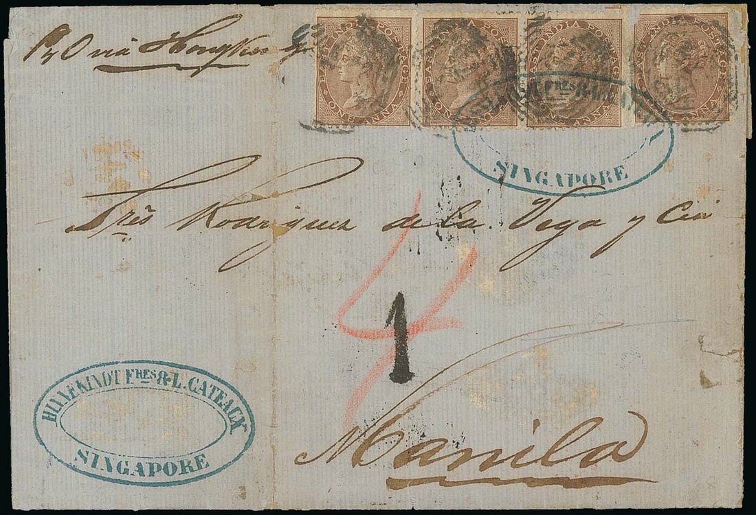 1865 (29 June) entire letter from Singapore to Manila, marked "P&O via Hong Kong", bearing 1865 1a. brown (4) tied by blue sender's cachet and "B/172" obliterator, showing red crayon "4" and handstruck "1" (reale) with, on reverse,