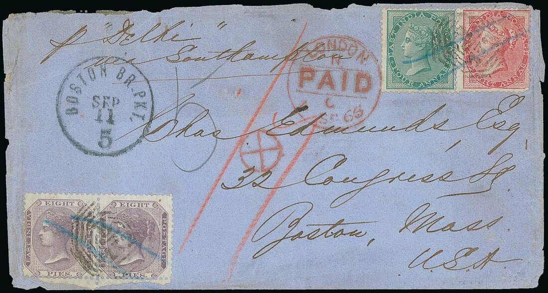 1866 envelope from Singapore to Boston, USA, marked "p Delhi via Southampton", bearing 1865 8p. purple pair, 4a. green and 8a. carmine, all crossed by blue crayon strokes and cancelled with "B/172" obliterator, showing red crayon "1/1", manuscript "5", red London Paid transit d.s. (1.9),