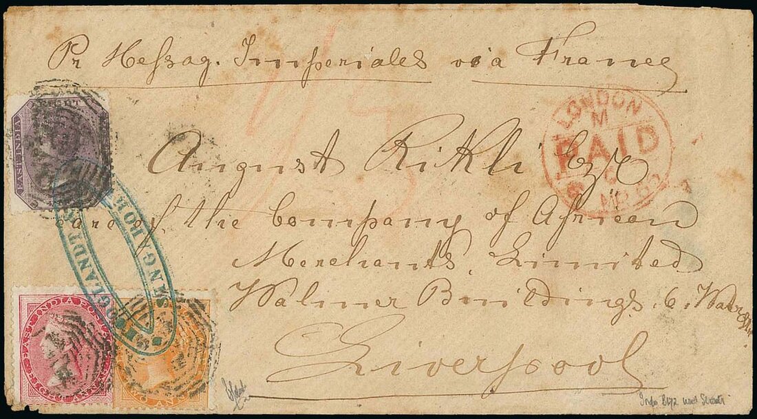 1866 (Feb.) envelope from Singapore to Liverpool, marked "Pr Messag. Imperiales via France", bearing 1865 8p. purple, 2a. orange and 8p. carmine, all tied by Hooglandt & Co. oval firm's cachet in blue and "B/172" obliterator, showing red crayon "1/3", red London Paid c.d.s. (6.3) with, on reverse,