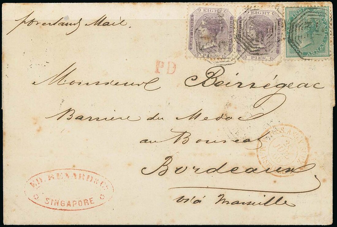 1866 (July) entire from Singapore to Bordeaux, marked "p overland mail", bearing 1865 8p. purple pair and 4a. green tied by "B/172" obliterator, showing unframed