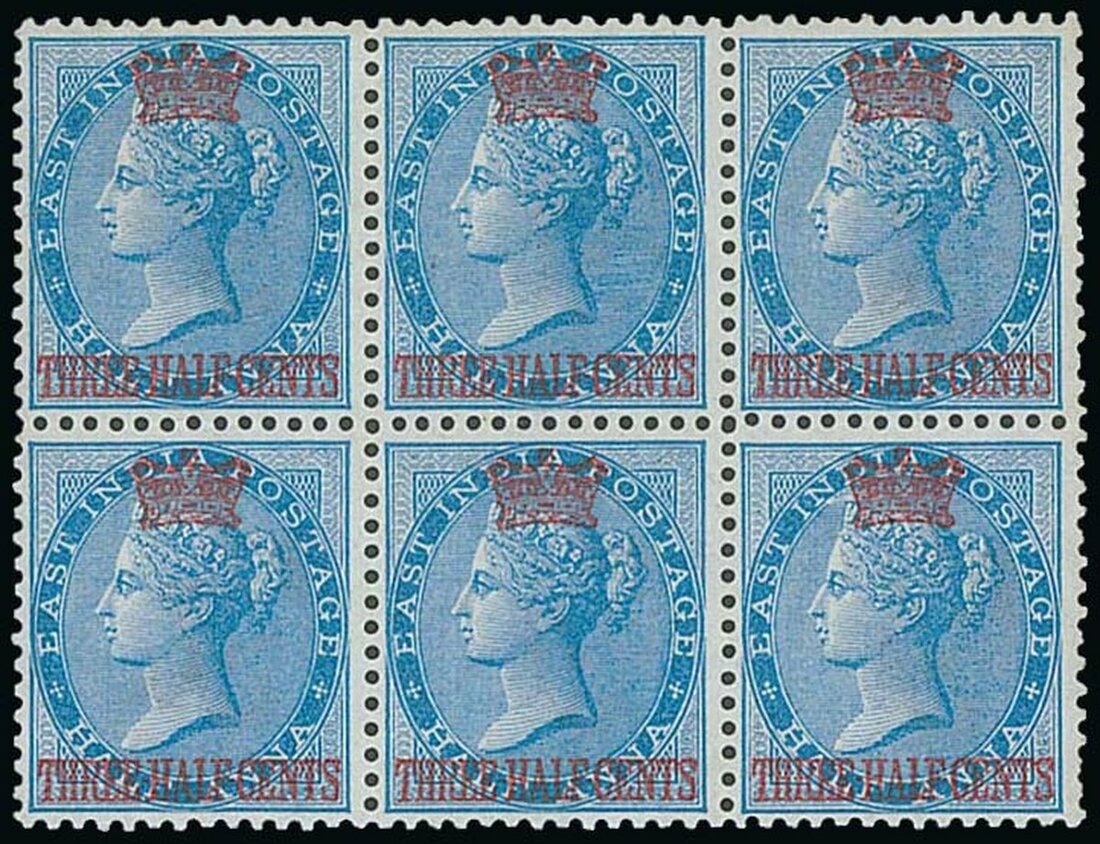 1867 (1 Sept.) on India, 1½c. on ½a. blue block of six (3x2), unused with large part original gum, fresh and fine. S.G. 1, £960. Photo