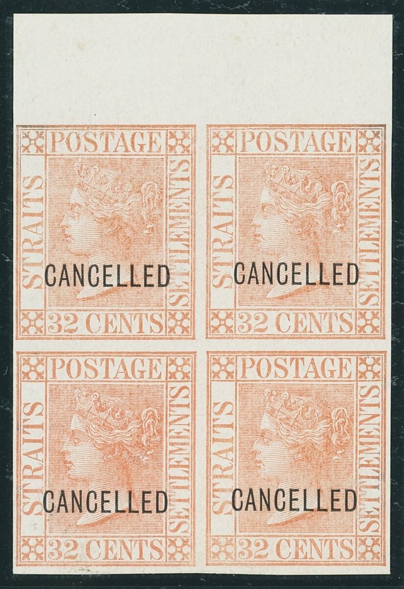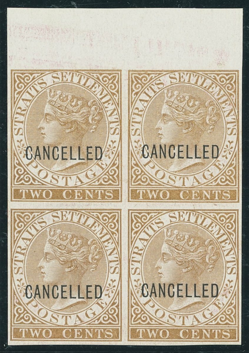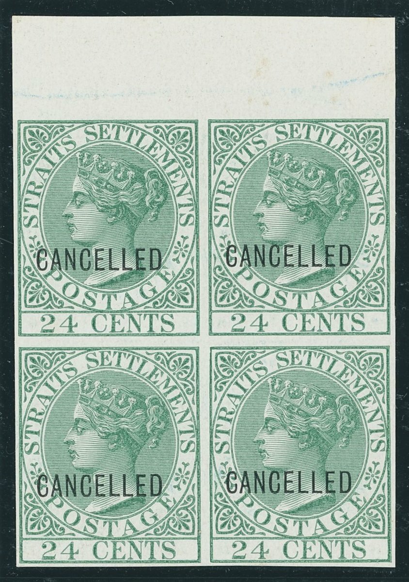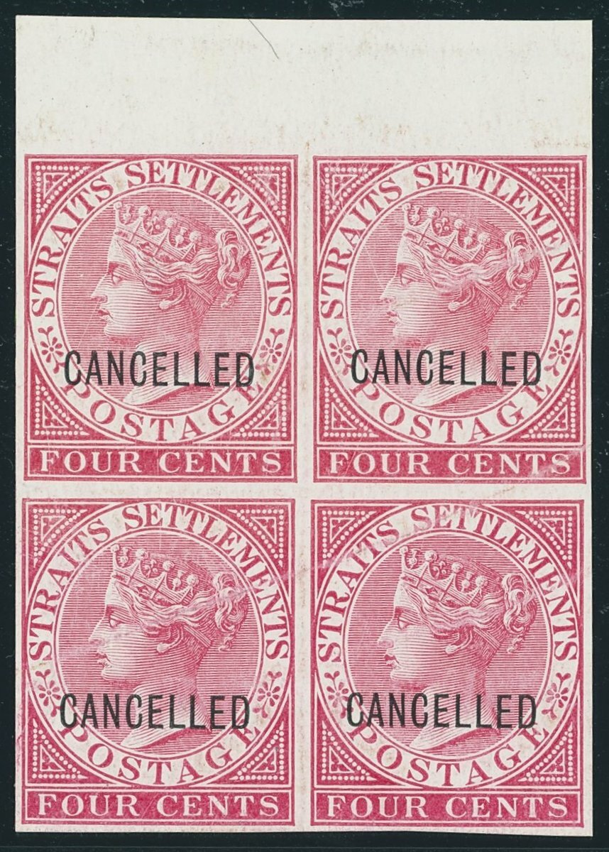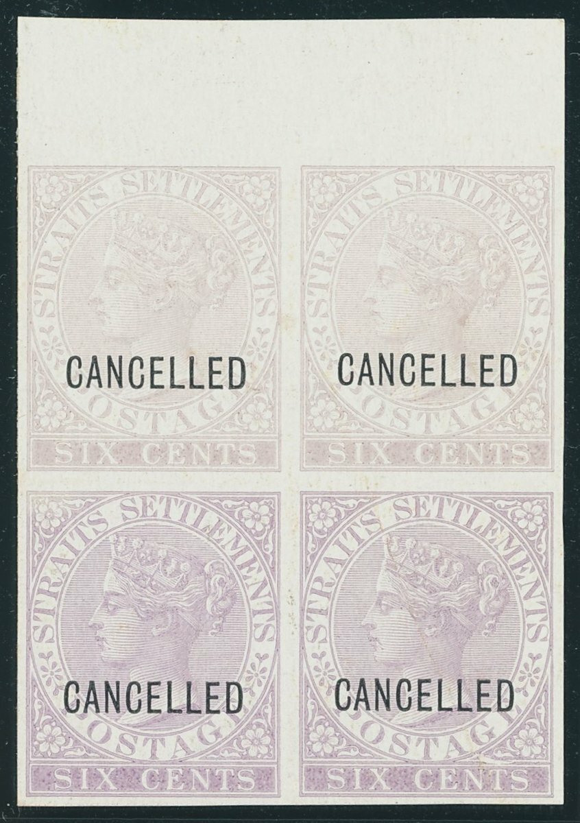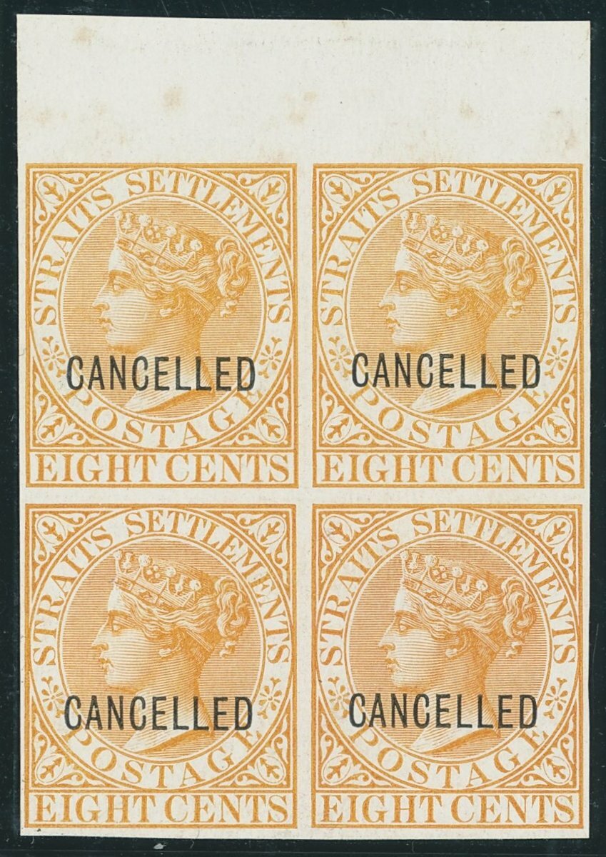 2c., 4c., 6c., 8c., 12c., 24c. and 32c., each in a matching imperforate block of four with margin at top in near to issued colours, all on glazed unwatermarked paper and each overprinted