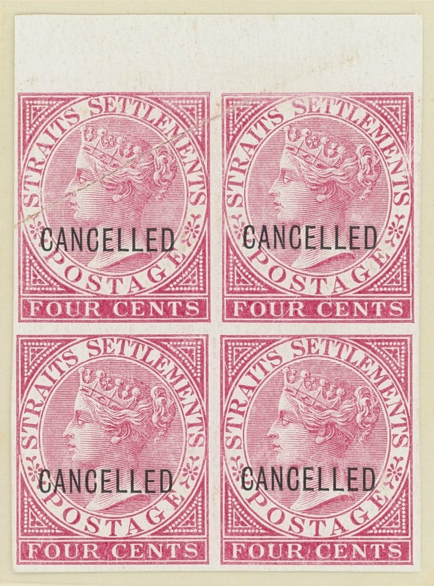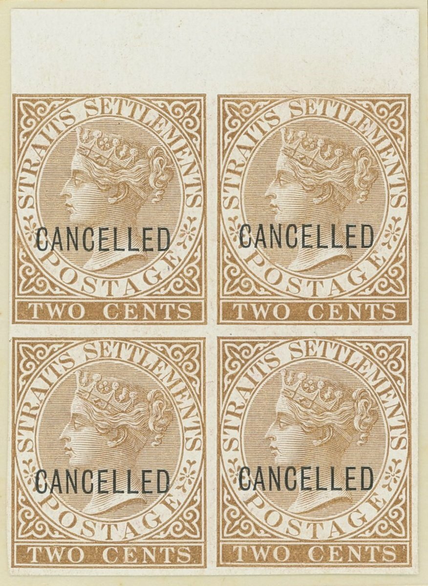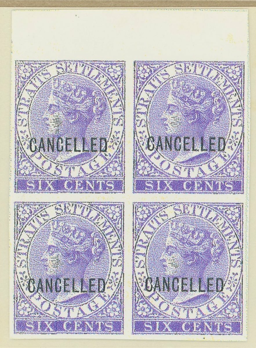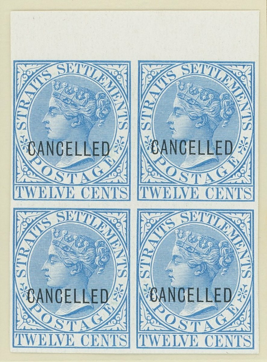 2c., 4c., 6c., 8c., 12c., 24c. and 32c. top marginal blocks of four, all in close to issued colours on surfaced unwatermarked paper, each overprinted