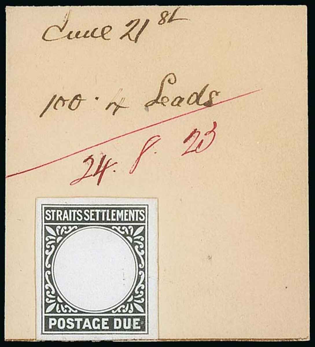 Master stamp-size die proof with blank value tablet in black on glazed card, affixed to piece (54x60mm) dated "June 21st", marked "100:4 Leads" and additionally dated "24.8.23" in red ink. Photo