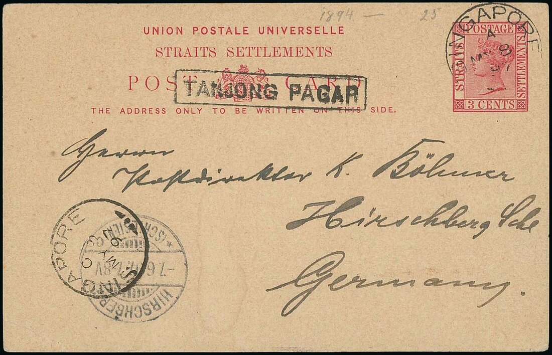 1897 (8 May) 3c. stationery card to Germany, cancelled by Singapore c.d.s. and showing superb framed