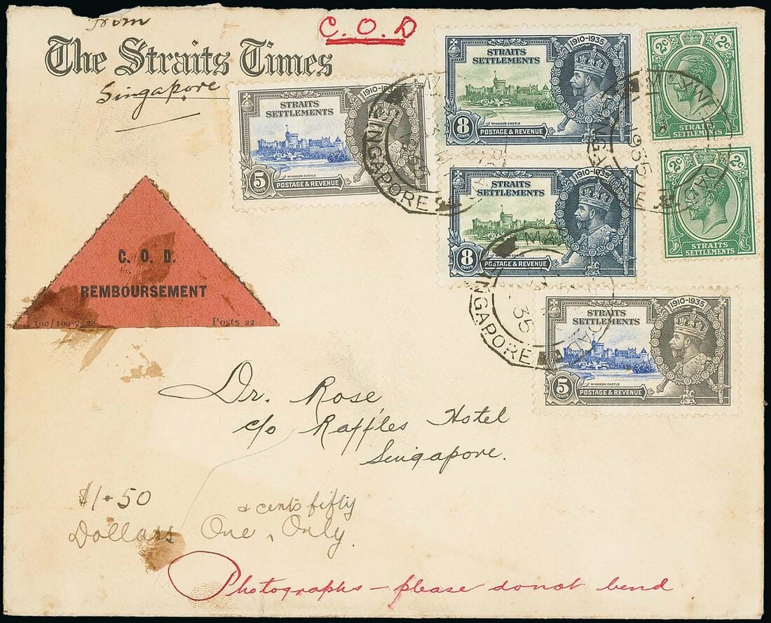 1935 (23 May) envelope with printed "The Straits Times" at top left to Raffles Hotel, marked "C.O.D." in red ink at top and "Photographs" at foot, bearing KGV 2c. (2) and 1935 Jubilee 5c. (2) and 8c. (2), all tied by