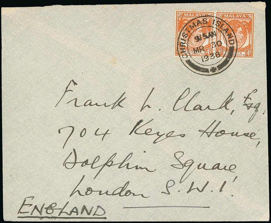 1938 (30 Mar.) envelope from Dr. J. Scott Clark, the Medical Officer, Christmas Island Phosphate Co., addressed to London, bearing Straits Settlements 1938 4c. orange pair tied by superb