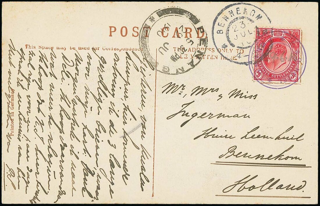 1910 (29 June) picture postcard (Race Course, Penang) to Netherlands, bearing KE 3c. tied by