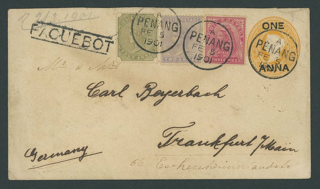 1901 (5 Feb.) India 1a. on 2a.6p. stationery envelope to Germany, bearing India 3p., 2a. and 4a., all tied by