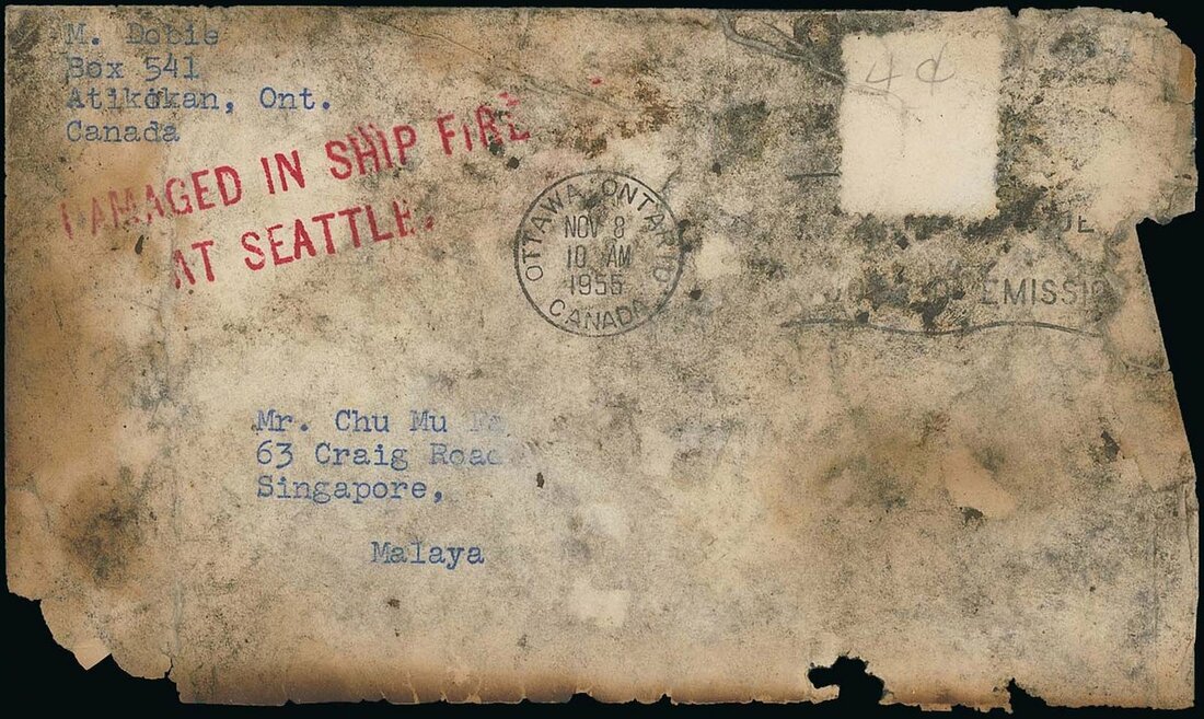 1955 (30 Nov.) M.V. "Ocean Mail", fire broke out in the mail room when an adjacent bulkhead was being welded following a collision with "Arizona" in the Columbia River, USA on 30 November; 8 November envelope (charred and stained) from Ottawa to Singapore, 4c. stamp washed off and showing a good strike of the