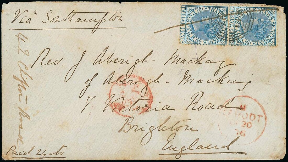 1876 (20 Oct.) envelope to Brighton, marked "Via Southampton", bearing 1867-72 12c. blue vertical pair placed sideways, tied by pen stroke and sharing clear "B/147" obliterator, showing good to fine