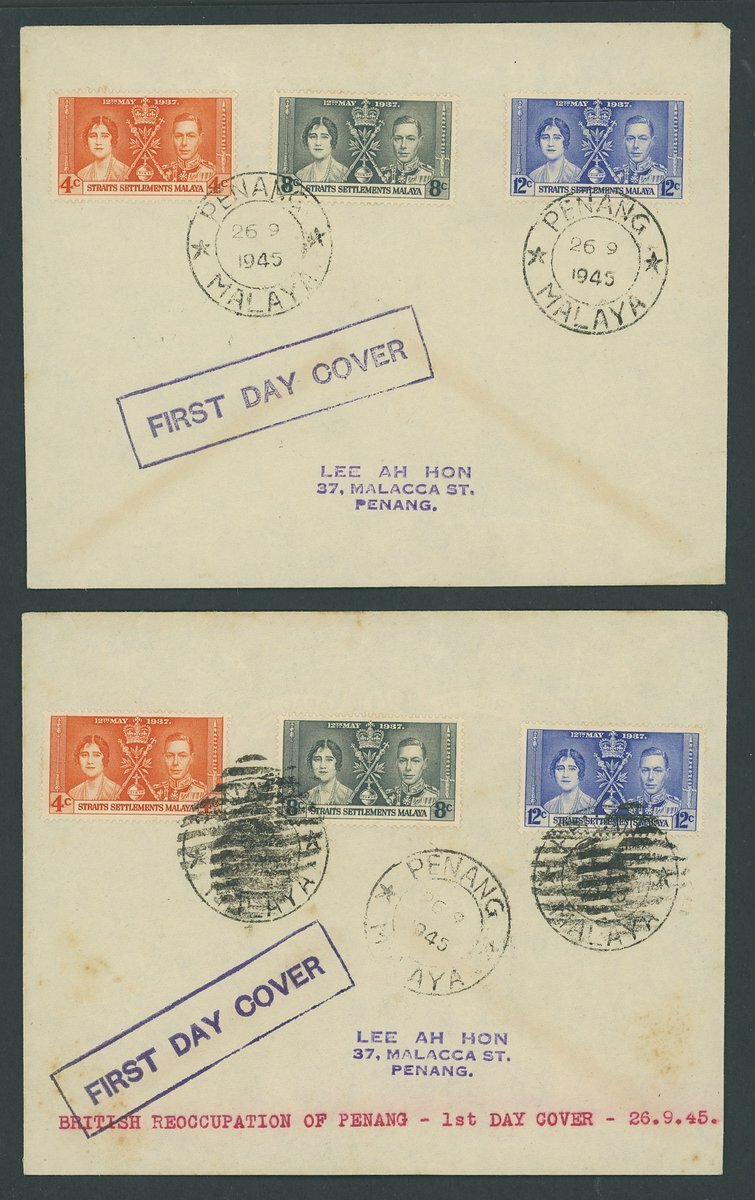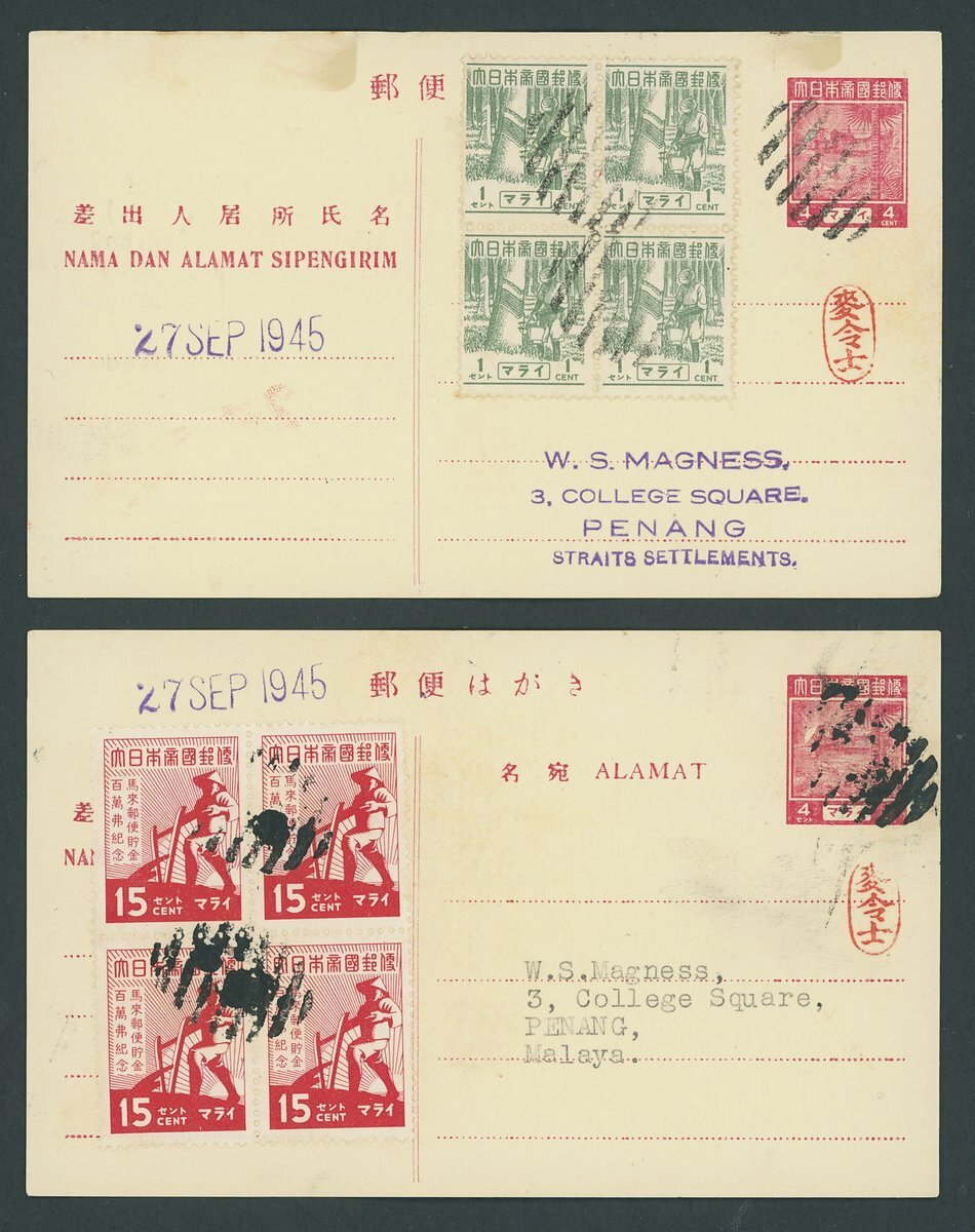 1945 group of covers relating to resumption of postal service and free post arrangements, including (3 Sept.) Occupation 4c. stationery cards (2), one bearing Ploughman 15c. block of four and the other Pictorial 1c. block of four, all cancelled at Penang by 8 bar oval obliterator on date of British re-occupation; (26 Sept.) first day covers (2) bearing 1937 Coronation set; (27 Sept.) and (9 Oct.) Penang free mail; (3 Oct.) Seremban free mail; and (10 Oct.), (17 Oct.) and (19 Oct.) Kuala Lumpur free mail. (12 items)