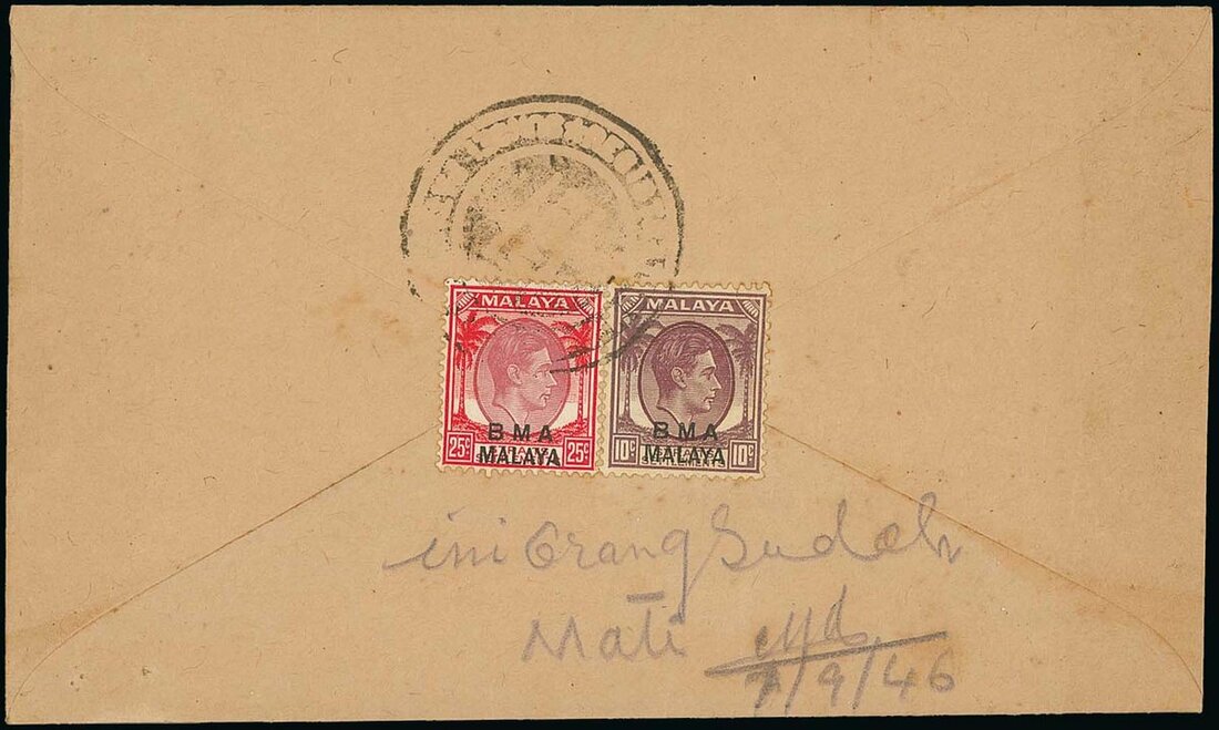 1946 (7 Sept.) envelope (with contents) registered from Sungei Patani to Kuala Ketil bearing, on reverse, 10c. and 25c. tied by rare circular