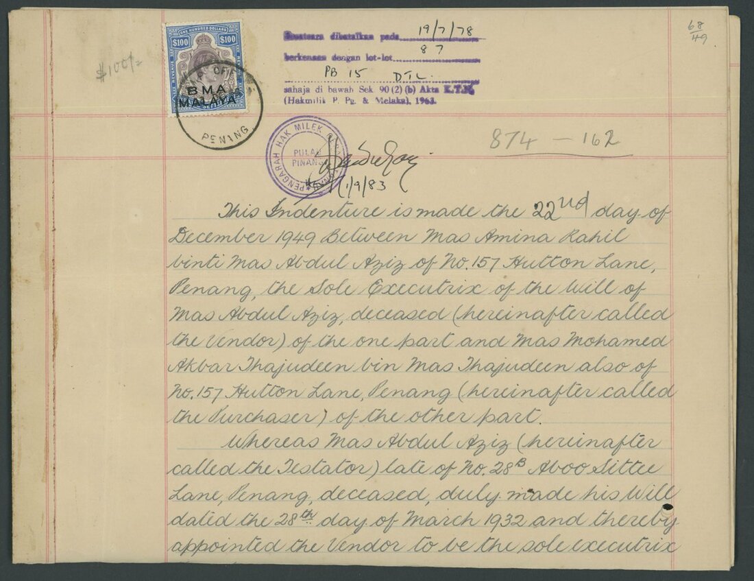 1949 (22 Dec.) Indenture bearing 1945 $100 dull purple and ultramarine tied by