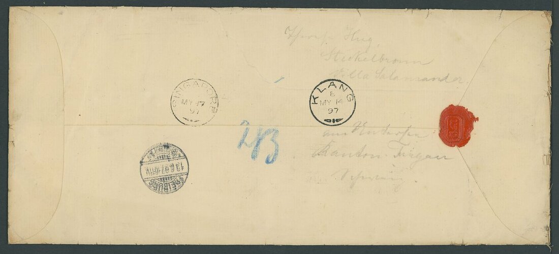1897 (13 May) envelope (282x124mm) registered to Germany, bearing Straits Settlements 1883-91 2c., 5c. (3), 1892 1c. on 8c. block of eight and a pair, and 1894 5c. pair and 8c., all cancelled with